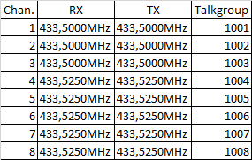 In this case, changing between channel 1, 2, 3 and 4 does not change the transmit and recieve frequencies but it does change the talkgroup used. For the user it will appear that they have "changed channels" but inreality they have just switched between talkgroups.